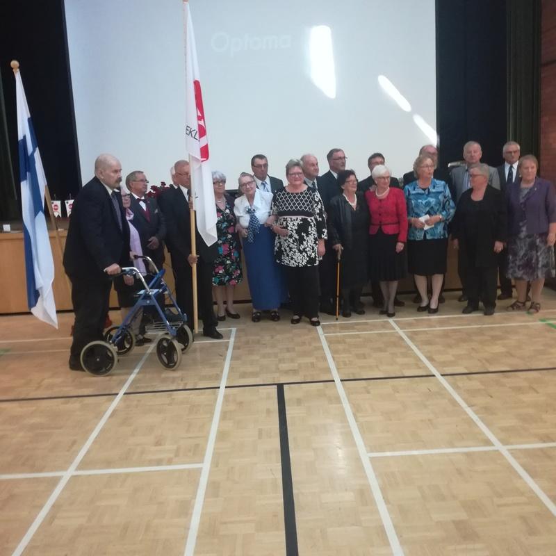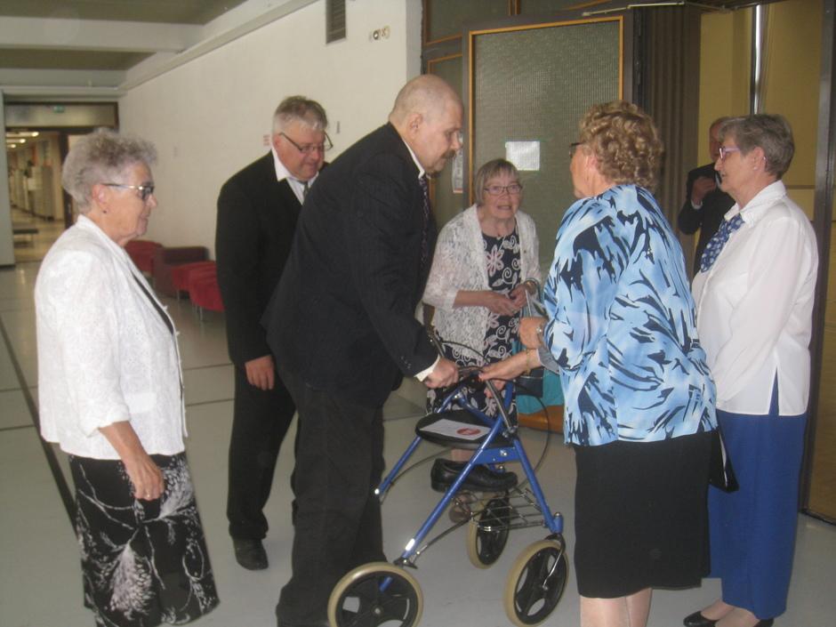 Joroisten Eläkkeensaajien delegaatio onnittelee juhlivan piirin puheenjohtaja Leena Teittistä ja sihteeri Marja Laitista