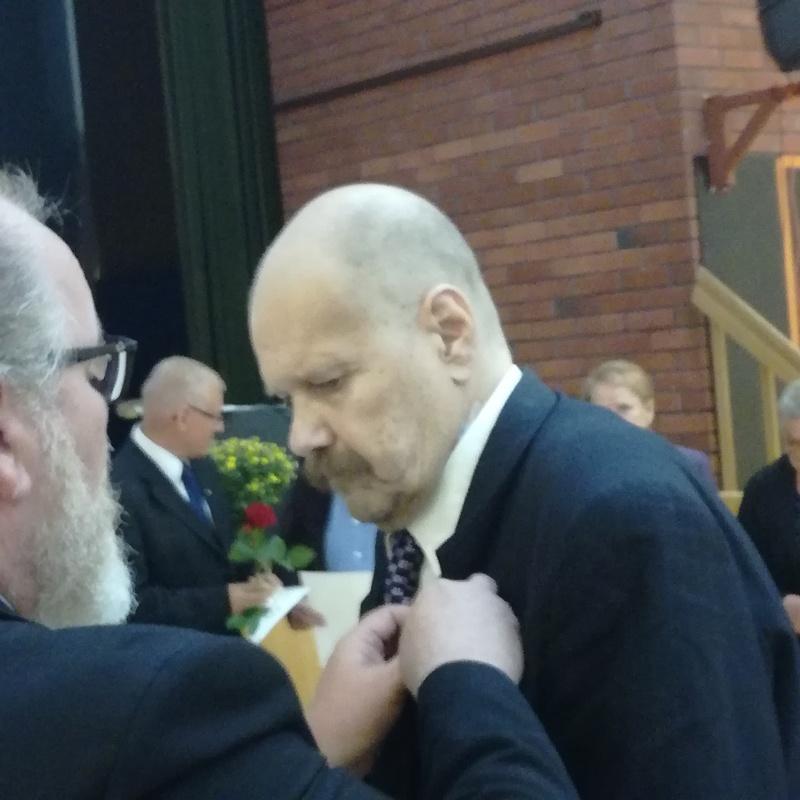 Toiminnanjohtaja Timo Kokko kiinnittää EKL:n kultaisen ansiomerkin Kari Otrasen takin rintapieleen
